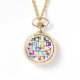This women's watch has a design of rectangles that are stretched on one end in groovy colours, orange, green, teal, purple, blue, pink, and yellow with atomic lines crisscrossing them.