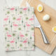 My original vector illustration of a mid century atomic oasis, with pink flamingos, atomic palm leaves, diamonds, starbursts and abstract water, in pink, aqua, green and black on antique off white.