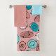 This towel set has a light turquoise washcloth, a dusty rose hand towel, and a bath towel with a mid-century modern atomic design of oval outlines with small circles on them and solid coloured ovals inside them.