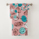 This towel set has a mid-century modern atomic design of oval outlines with small circles on them and solid coloured ovals inside them.