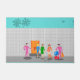 You are invited to the social event of the year with this Atomic Palm Springs Stewardess Party door mat design. Join these three vintage flight attendants from rivaling airlines as they check into their kitschy 1960s breezy block hotel. One of the fabulously hunky bellhops in a retro hot pink uniform holds the orange door while the other struggles with the women's luggage. Teal palm trees sway in the background of the impossibly turquoise sky as a jetliner flies overhead. This design will have you saying, “On your mark, jet set, go!”