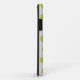 This phone case has a mid-century modern design of tan arches repeating on white as a background with repeating green-gold circles with darker green-gold starbursts inside them.