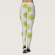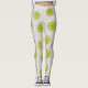 These leggings have a mid-century modern design of tan arches repeating on white as a background with repeating green-gold circles with darker green-gold starbursts inside them.