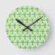 This clock is covered with a mid-century modern design of retro atomic starbursts on a green back ground.