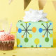 This wrapping paper is covered with a mid-century modern design of retro atomic starbursts on a green background.