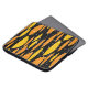 Atomic-style geometric pattern resonates with retro elegance in black and orange.