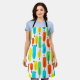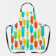 This apron has a mid-century modern design of long ovals in yellow, orange, green, and turquoise with black lines with circles on the ends.
