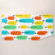 This towel set has an orange washcloth, a green hand towel, and a bath towel with a mid-century modern design of long ovals in yellow, orange, green, and turquoise with black lines with circles on the ends.