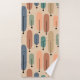 This towel set has a peach washcloth, a teal hand towel, and a bath towel with a mid-century modern design of long ovals in peach, green, blue, teal, and light brown with black lines with circles on the ends.