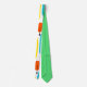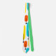 This necktie has a mid-century modern design of long ovals in yellow, orange, green, and turquoise with black lines with circles on the ends.