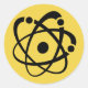 Asymmetrical atom symbol, black or yellow graphic, t-shirts, hoodies, buttons, stickers, cards, gifts.