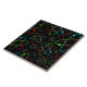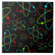 Simple line drawings of the atom in various bright colours set on a background of black tile.