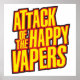 The phrase "Attack of the Happy Vapers" in a bold yellow and red logo based on retro horror movie poster lettering. Vaping humour for all happy ecig users.