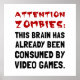Computer gamer nerds and console geeks joke ?Attention zombies this brain has already been consumed by video games?. Check out this funny custom design on tees, shirts, mugs, cases, gifts and apparel.