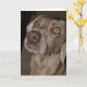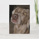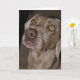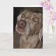 An attentive Weimaraner looking up on a vertical format greeting card with "I Love You" inside.