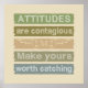 “Attitudes are contagious – make yours worth catching”. See my store for more items with this quote.