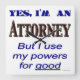 Yes I'm an Attorney, but I use my powers for good saying. Funny lawyer slogan for professionals in legal capital letters in blues and browns. Click Customise It to add your name or message, even save your design for later.