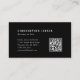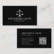 Present a professional image with this simple, minimalist black and white business card. The black background contrasts with the white justice scales logo and the white text to highlight your name, contact information and other details. A QR code on the back takes clients to your website.