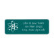 A deep teal return address label is decorated with a white planetary model atom on the left and sample text on the right for customising to make it your own.