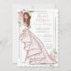 Pink and grey floral bridal shower invitation features customisable blonde, brown, auburn hair and skin tones in a gorgeous glitter wedding gown.