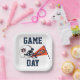 This spirited square paper plate design proudly showcases support for Auburn University! It features a classic football helmet with the iconic blue "AU" logo, centred between the words "GAME" and "DAY" in bold blue lettering. A vibrant orange pennant extends from behind the helmet, proudly displaying a stylised tiger mascot face and the word "TIGERS." The design is set against a clean white background, making it an ideal choice for any game day celebration or gathering.