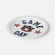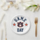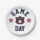 This spirited paper plate design proudly showcases support for Auburn University! It features the iconic Auburn "AU" logo prominently displayed at its centre, vibrant in its traditional orange and blue. Above and below the logo, the words "GAME" and "DAY" are boldly presented in blue, arched lettering, perfectly capturing the excitement of game day. Two vibrant orange stars flank the 'AU' logo, adding to the energetic display. The plate's clean white background makes it an ideal choice for any game day celebration or gathering.