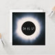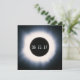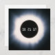 Artistic Image of a total solar eclipse in black and white dated August 21, 2017, showing the bright glow of the sun’s corona radiating from behind the blocking image of the full moon.