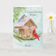 This hand-painted watercolor features a charming birdhouse adorned with a Happy Birthday banner, as a tufted titmouse and a cardinal stop by on a crisp January winter day. Soft seasonal details and gentle colors create a warm, thoughtful scene, making it a lovely birthday piece for Aunt who celebrates in January.