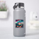 Vivid greens, pinks, and purples dance across the night sky, reflecting perfectly on the still waters of a lake. The scene is framed by a majestic mountain range, with snow-capped peaks adding to the drama. In the distance, small figures hint at campers or stargazers, enjoying this **once-in-a-lifetime spectacle.