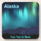 A multi-coloured, fractal rendering of the aurora borealis, or Northern Lights, superimposed on a digital painting of snow-covered mountains. Text reading "Alaska" appears in glowing blue and white. Customise by adding your own additional text.
