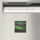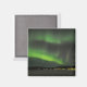 Souvenir photo magnet with green rays of aurora borealis (northern lights) in the night sky over a frozen lake in Lapland.