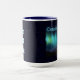 A multi-coloured, fractal rendering of the aurora borealis, or Northern Lights, superimposed on a digital painting of snow-covered mountains. Text reading "Canada" appears in glowing blue. Add your own additional text on the reverse side. The aurora borealis (or Northern Lights), named after the Roman goddess of dawn, Aurora, and the Greek name for the north wind, Boreas. Many cultural groups have legends about the lights. In mediaeval times, the occurrences of auroral displays were seen as harbingers of war or famine. The Maori of New Zealand shared a belief with many northern people of Europe and North America that the lights were reflections from torches or campfires. The Menominee Indians of Wisconsin believed that the lights indicated the location of manabai'wok (giants) who were the spirits of great hunters and fishermen. The Inuit of Alaska believed that the lights were the spirits of the animals they hunted: the seals, salmon, deer and beluga whales. Other aboriginal peoples believed that the lights were the spirits of their people. The connection between the Northern Lights and sunspot activity was suspected as far back as 1880. Thanks to research conducted since the 1950's, we now know that electrons and protons from the sun are blown towards the earth on the 'solar wind'. (Note: 1957-58 was International Geophysical Year and the atmosphere was studied extensively with balloons, radar, rockets and satellites. Rocket research is still conducted by scientists at Poker Flats, a facility under the direction of the University of Alaska at Fairbanks. The temperature of the sun's atmosphere is millions of degrees. At this temperature, collisions between gas molecules are frequent and explosive. Free electrons and protons are thrown from the sun's atmosphere by the rotation of the sun and escape through holes in the magnetic field. carried eartward in the solar wind, the charged particles are largely deflected by the earth's magnetic field. However, the earth's magnetic field is weaker at either pole and therefore some particles enter the earth's atmosphere and collide with gas particles in the higher layers (thermosphere). These collisions emit light that we perceive as the dancing lights of the north (and the south). Most aurorae occur in a band known as the auroral zone,which is typically 3° to 6° in latitudinal extent and at all local times or longitudes. The auroral zone is typically 10° to 20° from the magnetic pole defined by the axis of the Earth's magnetic dipole. During a geomagnetic storm, the auroral zone will expand to lower latitudes. The diffuse aurora is a featureless glow in the sky which may not be visible to the unaided eye even on a dark night and defines the extent of the auroral zone. The discrete aurora are sharply defined features within the diffuse aurora which vary in brightness from just barely visible to the unaided eye to bright enough to read a newspaper at night. Discrete aurorae are usually observed only in the night sky because they are as bright as the sunlit sky. Aurorae occasionally occur poleward of the auroral zone as diffuse patches or arcs (polar cap arcs, which are generally invisible to the unaided eye. Because the phenomena occurs near the magnetic poles, northern lights have been seen as far south as New Orleans in the western hemisphere, while similar locations in the east never experience the mysterious lights. However the best places to watch the lights (in North America) are in the northwestern parts of Canada, particularly the Yukon, Nunavut, Northwest Territories and Alaska. Auroral displays can also be seen over the southern tip of Greenland and Iceland, the northern coast of Norway and over the coastal waters north of Siberia. Southern auroras are not often seen as they are concentrated in a ring around Antarctica and the southern Indian Ocean. Auroral displays appear in many colours. Variations in colour are due to the type of gas particles that are colliding. The most common auroral colour, a pale yellowish-green, is produced by oxygen molecules located about 60 miles above the earth. Rare, all-red auroras are produced by high-altitude oxygen, at heights of up to 200 miles. Nitrogen produces blue or purplish-red aurora. The lights appear in many forms from patches or scattered clouds of light to streamers, arcs, rippling curtains or shooting rays that light up the sky with an eerie glow. Curtain-like structures show field lines in the Earth's magnetic field . The auroras that resulted from the "great geomagnetic storm" on both 28 August and 2 September 1859 are thought the most spectacular in recent recorded history. It was reported by the New York Times that in Boston on Friday 2 September 1859 the aurora was "so brilliant that at about one o'clock ordinary print could be read by the light". The aurora is thought to have been produced by one of the most intense coronal mass ejections in history, very near the maximum intensity that the Sun is thought to be capable of producing. It is also noteable for the fact that it is the first time where the phenomena of auroral activity and electricity were unambiguously linked. This insight was made possible not only due to scientific magnetometer measurements of the era, but also as a result of a significant portion of the 125,000 miles (201,000 km) of telegraph lines then in service being significantly disrupted for many hours throughout the storm. Some telegraph lines, however, seem to have been of the appropriate length and orientation to produce a sufficient geomagnetically induced current from the electromagnetic field to allow for continued communication with the telegraph operator power supplies switched off. Both Jupiter and Saturn have magnetic fields much stronger than Earth's (Jupiter's equatorial field strength is 4.3 gauss, compared to 0.3 gauss for Earth), and both have large radiation belts. Auroras have been observed on both, most clearly with the Hubble Space Telescope. 
