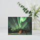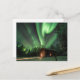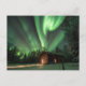 This postcard features a photo of the Aurora Borealis over a rural log cabin in the forest.