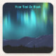 A multi-coloured, fractal rendering of the aurora borealis, or Northern Lights, superimposed on a digital painting of snow-covered mountains. Customise by adding your own text.