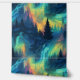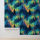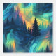 A seamless pattern featuring the blue-green and yellow hues of the aurora borealis, with silhouettes of pine trees scattered throughout. The design captures the ethereal beauty of the northern lights against a serene forest backdrop.
