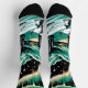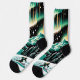 An enchanting night scene with skiers gliding past a cosy cabin under the spellbinding aurora borealis and a starry sky.