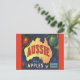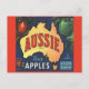 Aussie Apples from Tasmania is a vintage fruit crate label from 1933 . A map of Australia in the centre with red and green apples around it.