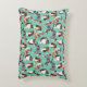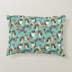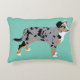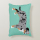 This throw pillow features a realistic style illustration of an Australian Shepherd puppy dog against a mint green background. The reverse side has a coordinating pattern of Aussies.