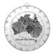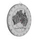 This decorative drawing was done in pen, ink, and graphite. It features an intricate pattern of repeated lines, shapes, stripes, leaves, pearl beads, parquet, spots, mushroom shapes, bamboo, floral patterns, and more, all interconnected and combined to form a map of Australia, including Tasmania, the island "dripping" off the southern coast of Victoria.