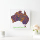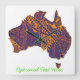 This funky bright and fun coloured image is the shape of Australia (including the heart-shaped island of Tasmania off the southern coast of Victoria), but instead of a classic map with roads and state borders and geographic features, this map is a doodled design with intricate swirls, twisting lines, loops, floral elements, and other interesting patterns. It's digitally altered with a combination of orange and purple hues to create a visually exciting artistic version of the Australian map.