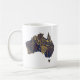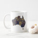 This image is an embellished decorative doodle design in the shape of the continent and country of Australia including Tasmania. I drew this in pen, ink, and graphite and then digitally altered it to colour it with rich hues of natural tan or khaki, dark navy blue, and dark maroon red.