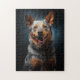 A close-up portrait of an Australian Cattle dog with a friendly, happy expression. The dog has a blue merle coat with brown markings, and its ears are perked up. It is wearing a black collar with a silver tag. The background is a dark blue with a subtle, blurred pattern. The dog's bright eyes and open mouth create a sense of joy and playfulness.