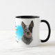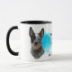A portrait of a beautiful Australian Cattle Dog is the feature on two sides of this mug. Each image is placed on a bright blue spatter background. Between the two images is the text that describes this loyal and protective companion, with "the CATTLE dog" in black at the bottom. All the text is easily customised to anything you'd like so that you may describe your own loyal friend.