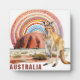 Digital art square tabletop plaque features a variety of AI-generated Australian elements including Uluru (Ayers Rock) in the distance, a kangaroo, and a sun made from Aboriginal dot artwork.