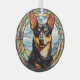 Here's a pretty glass ornament with a stained glass theme, featuring a pretty black and tan Australian Kelpie dog. The dog is set against a mosaic style blue and gold tone background. This makes a nice stocking stuffer or decoration for the household who loves a Kelpie.