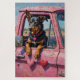 A detailed, rustic painting featuring a single energetic black and tan Australian Kelpie sitting proudly in the driver's seat of a dusty, vintage bright pink pickup truck (ute), with a large crimson heart-shaped dog tag. A ruggedly affectionate Valentine's Day gift for Kelpie owners.