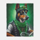 A furry friend behind the handlebars of a shiny green bike, wearing a green Saint Patrick's Day outfit that makes heads turn. The dog is dressed in a festive ensemble, complete with a green bow tie and a matching top hat that sits snugly atop their head. The outfit features intricate designs of shamrocks and leprechauns, making it clear that this dog is ready to celebrate Saint Patrick's Day in style.