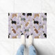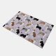 Cute Australian Shepherds / Aussie dogs in black, brown and merle coats sit and stand scattered dog bones and paw prints on a light purple background.
