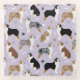 Cute Australian Shepherds / Aussie dogs in black, brown and merle coats sit and stand scattered dog bones and paw prints on a light purple background.