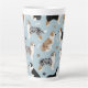 Cute Australian Shepherds / Aussie dogs in black, brown and merle coats sit and stand scattered dog bones and paw prints on a light blue background.